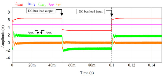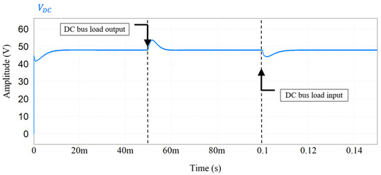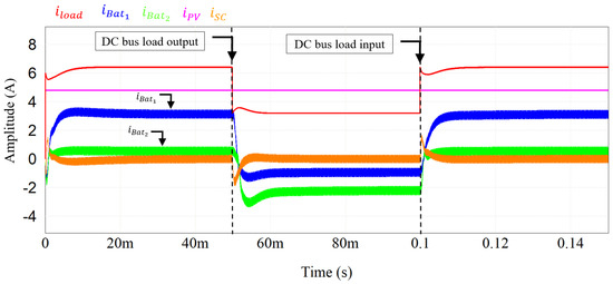 To evaluate the current distribution between the batteries the FBM control loop was implemented. Figure 7 shows the dynamics of the DC bus during a load transient. To evaluate the robustness of the control, a load input and output of 0.05 s and 0.1 s, respectively, was used. The simulation starts with a load of 15 Ω and is reduced by half and then back to the original value.