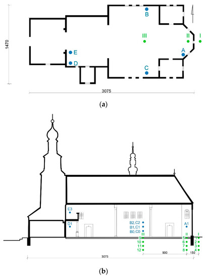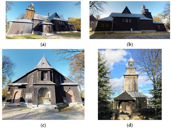 The object of the research was a historic wooden church located in the southern part of Poland. The walls of the building were erected on stone foundations. They were made in a carcass construction with external formwork. The floor of the building is made of 5 cm thick wooden boards placed on 14 × 14 cm joists. There was a 15 cm sand bed under the joists. The building is dominated by flat ceilings, while at the junction of the transept and the nave, an apparent dome-shaped vault was erected. The walls of the building are covered with polychrome from the inside. The saddle roofs are covered with sheet metal (Figure 2). The object in question dates from 1555.