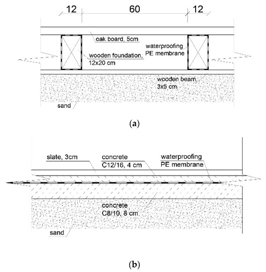 Material and construction solutions for the floor included in the analysis: (a) wooden floor; (b) stone floor.