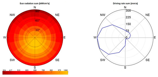 The computational analysis was extended with additional simulations of the building’s heating system in the case of a wooden floor (variant 3) and a stone floor (variant 4). The actual measurements of temperature and relative humidity of indoor air were used for the calculations. The intensity of solar radiation and the sum of annual precipitation was implemented for a typical meteorological year (TRY) for Krakow (Figure 6). The data adopted relate to 2019, which corresponds to the actual research period.