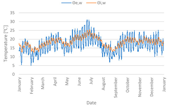 The field research made it possible to obtain selected parameters of the internal and external microclimate, which were used as boundary conditions for further computational analysis. The measured parameters were classified according to a given variant. In an unheated church with a wooden floor, the temperature of the internal air (Θi,w) ranged from 12.5 °C to 25.4 °C during the year (Figure 7). The outside air temperature (Θe,w) in the audited year reached the maximum value of 31.0 °C in June. In February, the minimum value of the outside air temperature of 5.0 °C was recorded.