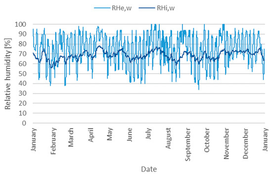 Measurements of the relative humidity of indoor (RHi,w) and external (RHe,w) air did not show a significant risk of water vapour condensation on the surfaces of the internal partitions. The values of RHi,w fluctuated in the range of 55.6–78.0% during the year, while RHe,w values ranged from 34.0 to 100% (Figure 8). The mean annual RHi,w value was 68.6% (median 68.5%), while RHe,w was 75.0%, with the median 77.7%.