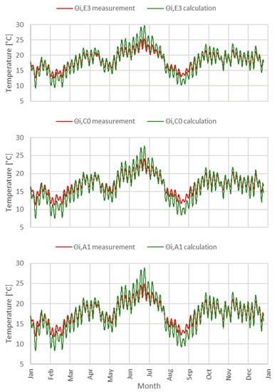 Selected curves of real and calculated indoor temperature in points E3, C0 and A1.