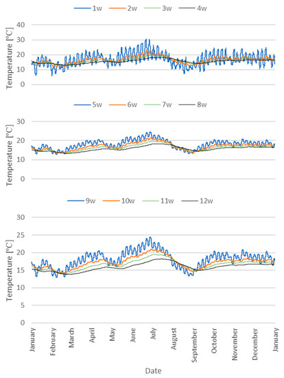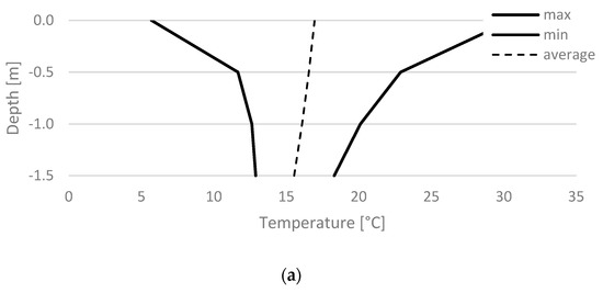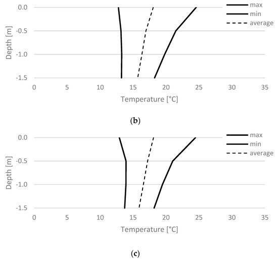 The field tests were supplemented with the results of the temperature of the floor and soil lying under the tested object. Simulations of this parameter in three measurement divisions allowed for obtaining detailed waveforms in the time interval every 1 h (Figure 10). The highest value of the ground temperature was recorded at point 1w (30.5 °C), located 0.05 m below the ground surface, on the eastern side of the tested object. The maximum value of the floor temperature at a point 0.50 m away from the eastern outer wall, at a depth of 0.05 m (point 5w), was 6.0 °C lower than point 1w and amounted to 24.5 °C. The floor temperature in point 9w was similar to the temperature recorded in point 5w. The differences in the obtained maximum, minimum and average values did not exceed 0.2 °C. Detailed characteristics of the minimum, maximum and average temperature of the floor and soil are presented in Figure 11.