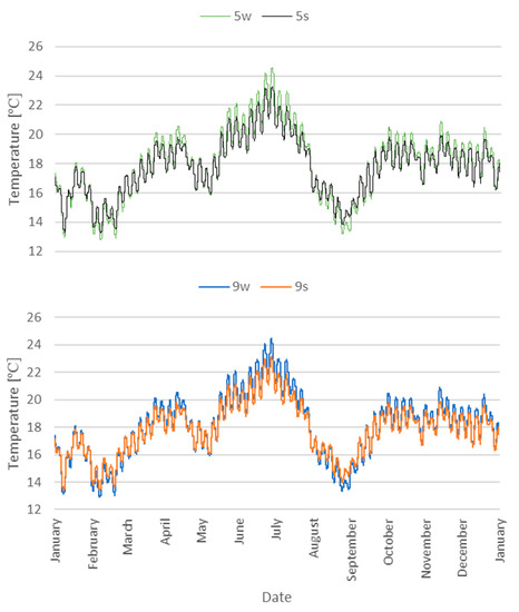 The analysis of temperature variation in variant 2 showed significant differences in the temperature of the floor inside the church at points 5w and 5s as well as 9w and 9s (Figure 12). The use of a stone floor contributed to the reduction in the annual amplitude of floor temperature fluctuations by 1.8 °C. In summer, a favourable phenomenon was found in the lower floor temperature by 1.3 °C compared to the wooden floor. In the autumn, winter and spring periods, a higher temperature of the stone floor was observed by 0.7 °C compared to the wooden floor, which should also be considered a favourable phenomenon.