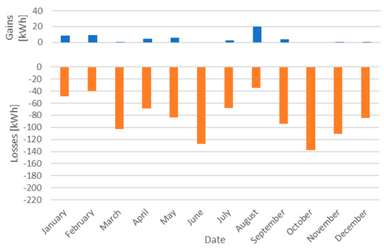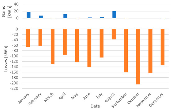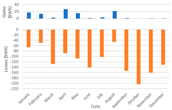The building with a wooden floor was characterised by significantly higher values of energy losses to the ground in relation to heat gains (Figure 13). During the year, the total energy losses to land amounted to 1005 kWh, while the gain was 47 kWh. The highest energy losses to the ground were recorded in October (141.7 kWh), while in August, the highest heat flux from the ground to the interior of the church was found (19.7 kWh).