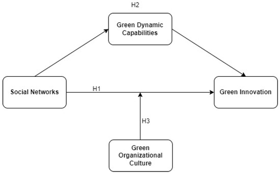 Thus, green dynamic capabilities help firms to become green in every way. According to many existing researchers, social networks are the antecedents of green dynamic capabilities [28,29]. When a firm receives valuable input in the form of information, advice, technology, and material from other firms, it tends to develop strong green dynamic capabilities. Once the firm has green dynamic capabilities, it attempts to reap a competitive advantage by capturing the market through green innovation. On the other hand, social networks provide resources and information to the firm for enhancing green innovation. From the above arguments, the hypothesis is formulated as: