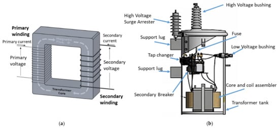 Different transformers will have different sizes and complexities; however, the working principles and the main parts are the same. The basic structure of an oil-immersed service transformer is shown in Figure 2b. The main additional components are the transformer tank, insulating oil, bushing, and tap changer.