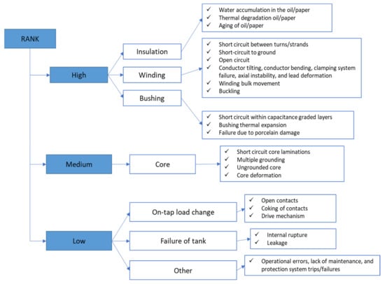 Based on the structure of the transformer, different research investigations are performed to locate the causes of the transformer failures to prevent these breakdowns. In [22], a model is presented that highlights the main failure components as core, insulation, winding, bushing, and transformer tank. The same is stated in [23,24,25,26]. In [27], the overall transformer condition is evaluated based on 15 input parameters; the paper also showed the importance of the insulation parameters in the transformer health assessment process. In [3], the authors focus on the failures that happened the most to the distribution transformers. After reviewing all the research, the importance rank of the various transformer component failures was summarized in Figure 3. It can be seen that the most important components which impact transformer health ideally could be a set of electrical, mechanical, and thermal, and are located inside the transformers. Other components such as the cooling system, tap changer, or lack of maintenance have less of an effect. These critical failures could be hard to locate non-invasively and require expensive sensors to monitor [28,29]. These sensors need to work precisely and are tough to install without interrupting the transformer operations, which is why they have not been deployed previously on the service transformers. Any potential monitoring methodologies which are inexpensive and simple to set up are of immediate interest.