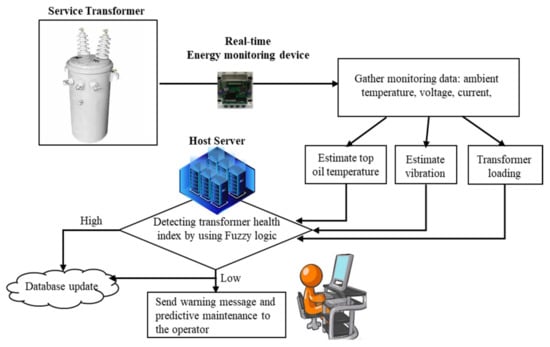 While the other substations are huge and expensive to maintenance, the service transformers have a much lower price. It is also because of the low cost that the service transformers are often not regularly maintained, but will be replaced when there is a breakdown. This way of management consumes a lot of equipment replacement costs for the utility side, and sometimes the emergency transformers also cause overvoltage, resulting in damage to the user’s equipment. This explains why not much research on health assessment for low-voltage transformer or service transformer has been carried out. In [17], a method was presented that uses the Artificial Neural Network to estimate the oil temperature from a transformer’s voltages and currents, then estimates the life reduction of a considered 45 kVA vegetable oil distribution transformer. In [18], a remote condition monitoring technique using inputs such as temperature, oil level, transformer loading, and humming sound was carried out to identify the condition of a distribution transformer. In [19], a wireless monitoring program using measured ambient temperature, voltage, and current was proposed to evaluate the distribution transformer condition every 90 s. In [20], a transformer health monitoring system was designed based on five measurable parameters and the image of a 15 kVA/400 V low-voltage transformer. The system requires four sensors on the transformer tank and one camera at the top of transformer. All of the mentioned approaches are still quite complicated, and require the installation of additional sensors on the transformers, which will add extra costs to monitor the low-voltage service transformers.
