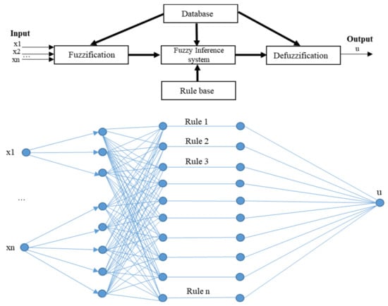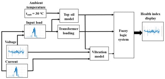 For transformer health assessment, several main techniques are studied such as fuzzy logic, machine learning, and health index calculation. The health index calculation method needs to be integrated with experience parameters, and it is difficult to deliver accurate results [37]. Machine learning could provide high accuracy results but requires large amounts of historical data of the transformer [38]. In this paper, fuzzy logic, which represents vague concepts, was chosen to solve problem where the conventional methods cannot be applied effectively [39,40,41]. The control system of this technique has three steps: fuzzification, inference, and defuzzification [42]. The system model is described in Figure 5. The system’s basic structure is illustrated in Figure 6.