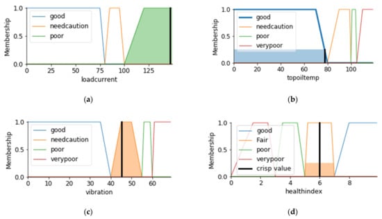 An example of Fuzzy control system operation. (a) Fuzzy membership inputs of transformer loading; (b) Fuzzy membership inputs of top oil temperature; (c) Fuzzy membership inputs of vibration; (d) Fuzzy membership output of Health index.