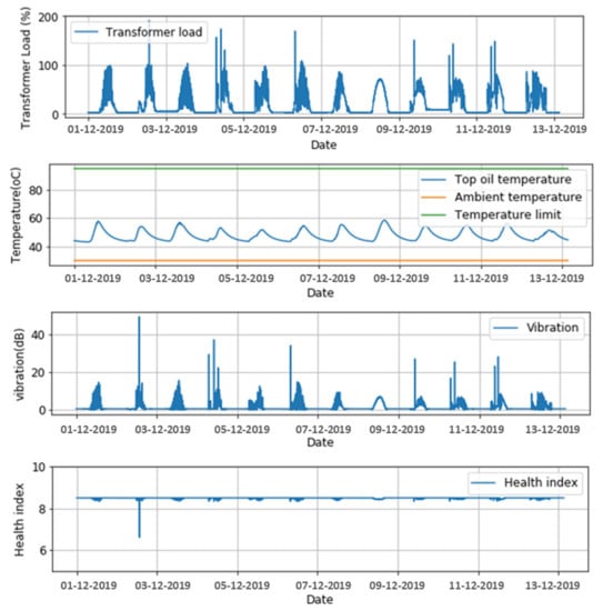 The HI is stable around 8.5. On 2 December, there an event happened which lead to increased transformer loading to almost 200%, vibration at almost 50 dB, and the top oil temperature remaining under 60 °C and not changing much. The overall heal assessment at that point is “Fair” condition. If the operators only accessed the 1-day evaluation on 2 December, they may have thought that the transformer needed to be taken care of to avoid any accident. However, looking at the whole assessment results in 2 weeks, it can be seen that the event is just an irregular fault which does not happen often. The overall health index in 2 weeks is “Good” condition. No special care is required beyond the regular maintenance in this case.
