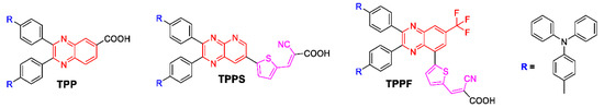 We developed a series of new organic D-π-A type and D-π-A-π’-A’ type photosensitizers (TPP, TPPS, and TPPF, as shown in Figure 1) based on pyrazine derivatives as acceptors (A), triphenylamine groups as donors (D), and phenyl groups as linkers (π). The thiophene–cyanoacryl group was applied as the auxiliary heterocyclic linkers-acceptor (π’-A’). The optical and electrochemical properties of TPP, TPPS, and TPPF were investigated. The photovoltaic performances of DSSCs based on these organic D-π-A-(π’-A’) type photosensitizers were evaluated.