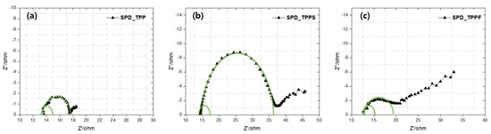 Electron lifetime (τe) values derived from peak frequency (fpeak) in the frequency region corresponding to the TiO2/photosensitizer/electrolyte interface are shown in the Bode plot (Figure 12), according to τe = 1/2πfpeak. Electron lifetime values of TPP, TPPS, and TPPF from curve fitting were 0.032, 0.188, and 0.042 ms, respectively. A longer electron lifetime indicates a more effective suppression of the back recombination reaction of the injected electrons with I3− in the electrolyte [34]. Electron lifetime values of these synthesized TPP, TPPS, and TPPF photosensitizers were too low to be considered to affect performances of DSSC devices.