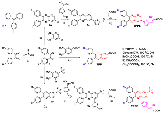 The synthetic process of photosensitizers (TPP, TPPS, and TPPF) was described in Scheme 1. Product 1 was performed via Suzuki–Miyaura coupling between 4,4′-dibromobenzil and two triphenylamine group. After that, product 1 reacted with 2,3-diamino-5-bromopyridine, 3-bromo-5-(trifluoromethyl)benzene-1,2-diamine, and 3,4-diaminobenzoic acid to form 2a, 2b, and TPP, respectively. Then, 3a and 3b were synthesized by the introduction of the thiophenecarboxaldehyde group to 2a and 2b via Suzuki–Miyaura coupling, respectively. Finally, TPPS and TPPF were produced by Wittig reaction of 3a and 3b with 2-cyanoacetic acid in galactic acetic acid.