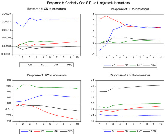 The variance decomposition analysis results reveals that at the 5-year predicting ambit, about 96.3% of the one-step forecast variance in per capita CO2 emissions is explained by its shocks, while overall, 3.7% is explained by financial development, renewable energy consumption, and economic growth. In the long run, say 10-year forecasting period, the response of CO2 emissions to its innovations reduces, though insignificantly, to about 95.1%, while the response to innovations in financial development, renewable energy consumption, and per capita economic growth is expected to rise to 4.9%. Among this 4.9% of the variance, 3.3% is attributed to innovations in per capita economic growth, 1.4% is due to innovations in financial development, and a mere 0.2% is due to innovations in renewable energy consumption. These findings emphasize that the largest proportion of changes expected of CO2 in the future will be generated by itself. The forecast impacts of financial development, per capita economic growth, and especially renewable energy consumption seem to be weak.