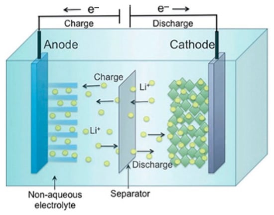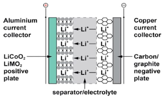 Lithium-ion (Li-ion) batteries store energy in positive electrode materials composed of lithium extracts adequate for reversible physical adsorption of Li-ions and negative electrode materials made of carbon and can properly support Li in the solid state [30]. Since Li interacts severely with water, non-aqueous electrolytes are employed [31]. These are ionizable organic diluents, such as propylene carbonate, in solution with adequate lithium salts. To improve the safety of the cells, the separators are microporous plastic strips that may be covered with ceramic particles, as shown in Figure 7.