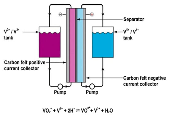 Utility-scale energy storage has some promise thanks to flow batteries. There are many different compositions, but they all have energy-producing cells with electrode material stored remotely, making it possible for very large storage batteries to be made [38,39]. Vanadium redox batteries (VRB) are made up of cells with carbon composite electrodes submerged in a fluid containing aqueous acid and vanadium sulfate, with different valence states separated by an ion-selective membrane. At the positive electrode during discharge, V5+ is converted to V4+, while V2+ is converted to V3+ at the negative electrode. The volume of the vanadium sulfate solution, and hence the battery’s capacity, is potentially limitless because it is kept in a storage tank. Recharging causes reverse reactions, which replenish the materials. The batteries are complicated to use and made of heavy materials, but their expected lifespan is very lengthy. Only a few prototype systems have been implemented so far, and given the size of the battery, VRB batteries are only practical for utility energy storage. Figure 10 depicts the chemistry and main parts of a vanadium redox flow battery.