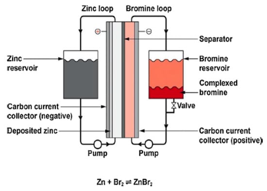 Another kind of flow battery is the zinc–bromine (Zn-Br2) battery, as shown in Figure 11. Zinc bromide is synthesized when Zn reacts with Br2 within the cell. Br2 is injected into cells with carbon electrodes and a microporous plastic separator in an aqueous solution as an organic complexing agent [40,41].