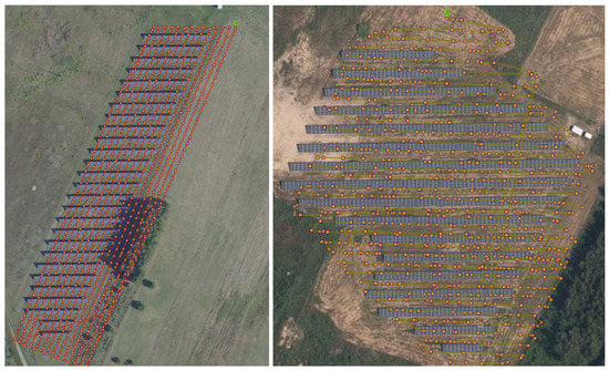 Malfunctions of a photovoltaic installation caused by faulty modules or electronic components or just shading of installation parts can be easily and quickly detected by analyzing images taken with a thermal imaging camera. In the case of installations that are difficult to access or extensive, such images are best taken with the help of an unmanned aerial vehicle (UAV) which can be controlled manually or appropriately programmed based on a map of the installation (see Figure 1). In the latter case, the flight over the farm is performed completely automatically based on GPS coordinates. Each image on top of the visible image and thermal data also contains a fairly precise location and information about the camera’s position, which allows locating the damage detected in the image on a map of the installation.