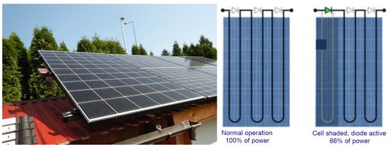 The most significant impact on the performance of the installation can be observed in the case of shading or covering the entire lower part of the string. Such a situation is presented in Figure 9. The installation still produces 2.4 kW, about half of its maximum output. In the case of standard 60-cell modules, such a situation could shut down the maximum power point tracking module of the inverter [] due to a too-low chain voltage. Half-Cut modules, however, handle this type of problem quite efficiently.