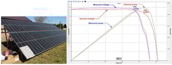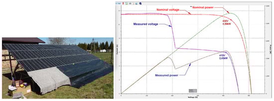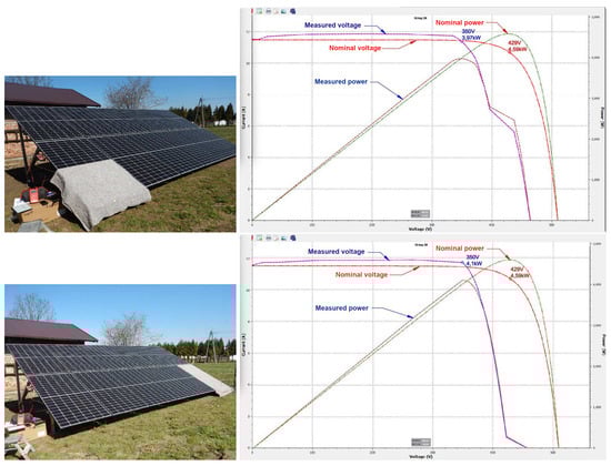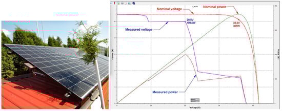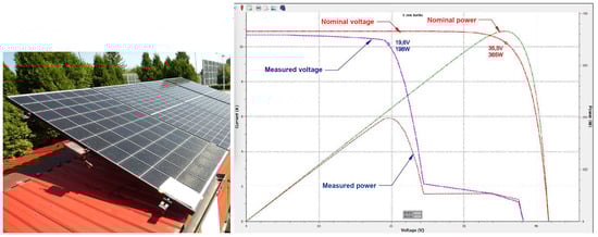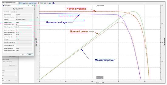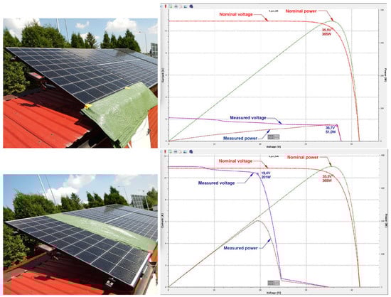 Figure 3 shows the current–voltage characteristics of a module illuminated correctly and without shading. However, it can be noted that the voltage and power values are different compared to nominal. This is due to several reasons []. The nominal characteristic is shown in a graph created for a new module operating under STC conditions; in the test case, we are dealing with a module that is already two years old and, therefore, partially degraded. An additional factor affecting the lower voltage operation is the high surface temperature of the module, which translates into a decrease in its voltage. The abovementioned factors are completely normal, and such modules are considered efficient.