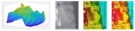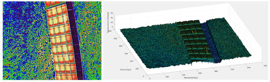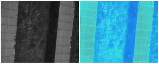 According to IEC TS 62446-3, aerial infrared thermography can reveal nine kinds of problems: overheated conductor strips, overheated cells, broken front glass of the module, overheated junction boxes, short circuits in string and substrings, disconnected string and substrings, and partial shading of modules. These problems are represented in IRT imagery by characteristic patterns; some are shown in Table 2. In the authors’ opinion, the most important function of this table is to draw the reader’s attention to the fact that the image presented on the camera’s display and stored on the memory card is just one of many possible representations of the registered temperatures. Depending on the temperature scale, color palette, and filters used, the same temperature can be depicted differently, and characteristic patterns of defects can be highlighted or blurred. To emphasize this remark in Figure 10, the DJI camera image used to create the third and fourth rows in Table 2 is compared to the temperature distribution extracted from the picture metadata.