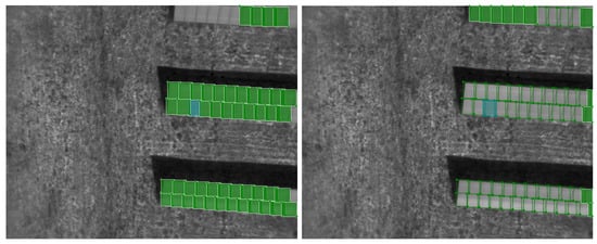 The dataset used in the experiments consists of 1060 aerial thermographic images collected at various PV farms in Poland in 2021 and 2022. The quality of the images varies; the two extreme cases are presented in Figure 12. Human experts processed all images with the help of two tools: the Thermal Studio Suite [] with Sense Reporting plugin [] used for image labeling, and the labelme [] public domain graphical image annotation tool heavily extended by one of the authors. Two kinds of labeling were applied. The first one was aimed at the semantic segmentation of the images, which is not the subject of this paper. The other labeling was much simpler and oriented to be applied just for YOLO DNN. In Figure 13, both labelings are compared. It must be mentioned that the exact segmentation, shown in the left inset of Figure 13, is much more labor-intensive but also has more potential applications. It can be easily converted into the labels seen in the right inset of Figure 13, while automatically converting the bounding boxes into a segmentation is difficult. On the other side, bounding box labeling is much faster and easier. It took one 30 min to create the exact labelings shown in the left inset of Figure 13, but only less than 1 min to create what is shown in the right inset. The reader should note that segmentation is always based on the thermal, not visible image. The natural resolution of all thermograms is 640 × 512 pixels, so it is necessary to enlarge an image for manual labeling.