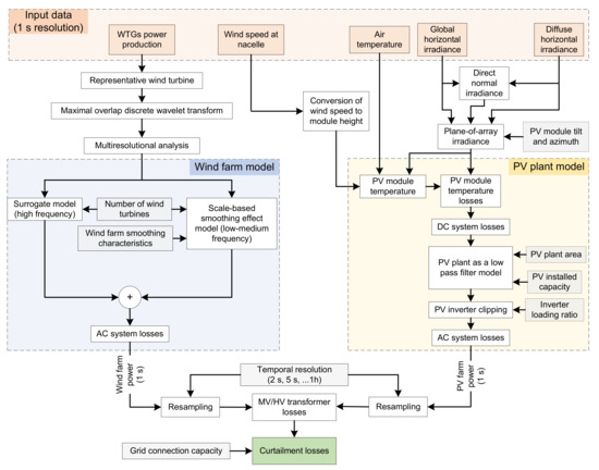 Hybrid wind–solar plants have multiple advantages over pure wind or solar PV plants, including but not limited to, more efficient grid utilization and land use, decreased grid infrastructure, project development, and balancing costs [5]. As emphasized in [5], the only way to fully exploit the HPPs is to install higher wind–solar capacity than the agreed grid connection capacity. Thus, system planners need to design HPP in such a way that the curtailment losses, which occur whenever the potential wind and solar generation exceeds the grid connection capacity (grid cut-off power), are sustained at acceptable levels. The grid curtailment is assumed to occur instantly, i.e., the HPP control system reduces the power output of either the solar or wind farm whenever HPP instantaneous power production is above the grid cut-off power. However, when curtailment estimation studies are prepared, planners are often limited with low-resolution data, which forces them to deliver calculations in 10 min, 15 min, or most frequently, 1 h averaged time resolutions. The averaging process causes loss of information about the power fluctuations inside the interval and flattens the power peaks occurring in shorter time frames [6]. Power peaks of wind and solar generation inside the averaging interval can cause the potential HPP power to exceed grid cut-off power and introduce curtailment losses, while simultaneously the average power will not. Therefore, the use of lower time resolutions will underestimate actual curtailment losses.