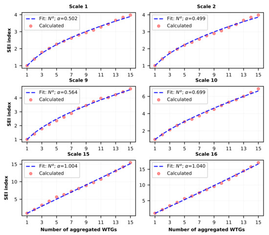 In Figure 2, the SEI as a function of aggregated WTGs in wind farm is represented for scales 1 and 2 (high frequency), 9 and 10 (medium frequency), and 15 and 16 (low frequency). When 1 s data are used, the first scale represents the power fluctuations with the periods between 2–4 s, the second scale 4–8 s, etc. The SEI function is fitted with a function , obtaining for each scale. It can be observed that the SEI tends to increase by a factor of () for higher frequency power fluctuations and N (linear increase, ) for lower frequency fluctuations. In general, the increase of SEI for a specific frequency scale can be described by the function , where is termed as “smoothing exponent”.