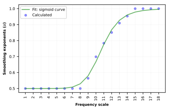 Smoothing exponents for various scales can be fitted with a sigmoid function (a and b being the parameter of the sigmoid function) of the form: