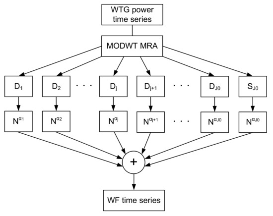 The basic idea behind the proposed wind farm power production model is to take into account the smoothing effect applied over various scales by multiplying each time-adjusted frequency scale with the corresponding SEI and aggregating the power time series of each scale. The time-adjusted frequency scales are obtained by applying MODWT based MRA, which is an additive transform.