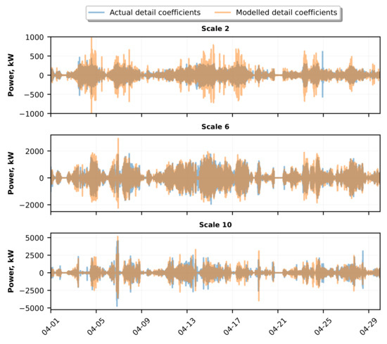 Figure 5 compares detail coefficients on scales 2, 6, and 10 of eight (8) aggregated WTGs and those obtained by the model using scale-based SEI values as a multiple of single WTG detail coefficients.