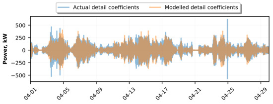 To solve the problem on high-frequency scales, a different approach based on the surrogate time series method is used. The method tries to preserve important statistical properties of the detail coefficients. As it can be seen from the Figure 5, the high-frequency fluctuations of aggregated WTGs are locally decorrelated (i.e., amplitudes of high-frequency power fluctuations rarely appear simultaneously on multiple WTGs), but in general show similar long term trends (periods of higher and lower local variance). Therefore, the idea is to create multiple realisations (i.e., N multiples) of the detail coefficients with locally decorrelated structures, but similar variance trends. In this way, imitation of high-frequency detail coefficients can be obtained.