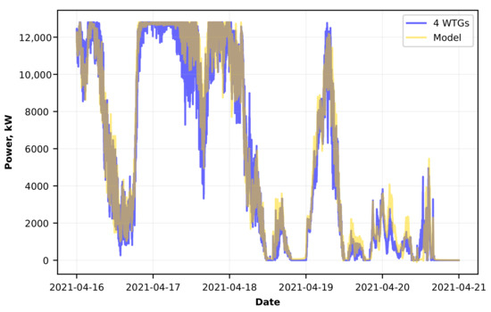 The proposed wind farm model introduced in previous subsections was inspected on a configuration with four aggregated WTGs with 3200 kW nominal power, while the representative WTG is selected from four WTGs. The amplitude parameter of the Gaussian random numbers for the surrogate method is 1 day (86,400 s), while , meaning that the surrogate method is applied on the first nine scales and SEI-based model is used on the remaining scales. The power output of four aggregated WTGs and the proposed model are shown for the 5 day period on Figure 7.