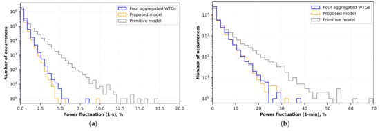 The comparison of the power fluctuations of four aggregated WTGs in wind farm, the proposed wind farm model, and a primitive model is depicted on Figure 8 for (a) 1 s resolution and (b) 1 min resolution data representing empirical histograms with 40 bins. It is evident that the primitive model cannot capture the power fluctuations accurately since higher frequency components are scaled linearly, which causes abrupt changes of power output that normally do not occur. This effect is present in both 1 s and 1 min resolution data. In contrast, the proposed WF model accurately preserves the power fluctuations.