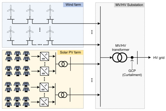 The PV plant topology considered in this paper assumes AC coupled system with fixed-tilt PV modules, DC cables, PV inverters, LV cables, LV/MV transformers, and MV cables. The PV plant does not share direct connections with the wind farm (e.g., via DC/DC converters) except for the MV cable connections at MV switchgear in MV/HV substation. In addition, the connections between the internal components of PV systems are not analysed in detail, but rather by their contributions to the system losses.