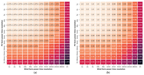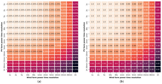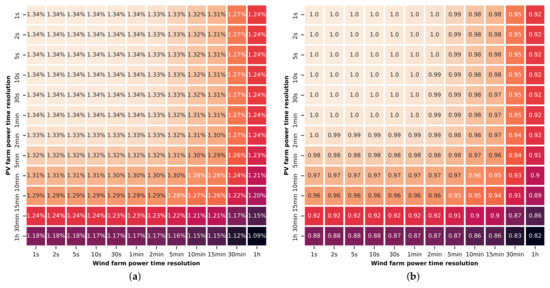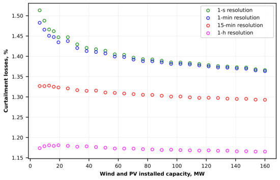 The findings of this paper suggest that 15 min resolution provides an accurate estimate of curtailment losses in large-scale hybrid wind–PV plants, and it is generally preferred over 1 h resolution when more accurate curtailment estimation is required. The use of 1 min time resolution can additionally improve the curtailment losses estimation accuracy over 15 min resolution, but the improvement is not significant for wind/solar PV plants with installed capacity above 10 MW/10 MWp. In addition, the use of sub-minute time resolutions has no further effect compared to 1 min time resolution for large-scale wind–PV farms.