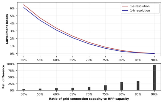 The ratio of grid cut-off power and HPP installed capacity is an important aspect during the planning and design process, as low ratio values can result in excessive curtailment losses. However, the ratio has reverse effect on additional curtailment losses. Namely, when the ratio is, e.g., 90%, the additional curtailment losses captured in higher resolutions will increase compared to the 70% case, but at the same time the curtailment losses will be relatively small. Therefore, the impact of additional increase of curtailment losses may be irrelevant. In contrast, lowering the ratio to, e.g., 50% may increase the curtailment losses to relatively high values, but additional losses captured in higher resolutions will decrease compared to the 70% case.