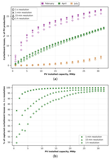 For a 5 MWp PV plant, percentage-wise this is an increase from 3.2% in 1 h resolution to 4.8% in 1 s resolution. In contrast, curtailment losses captured with 1 min resolution are 79% for April and 84% for February in comparison to 1 s resolution. In the case of 1 MWp solar PV farm, during February curtailment losses captured in 15 min resolution were roughly 50% of the 1 s curtailment losses, indicating that higher time resolution may be needed when curtailment losses are evaluated for smaller-scale PV plants.
