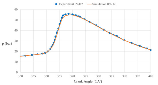Validation in-cylinder pressure versus crank angle at 0% hydrogen fractions [37].