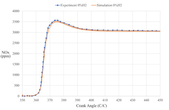 Validation NOx emission versus crank angle at 0% hydrogen fractions [27].