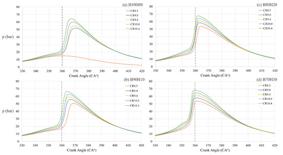 Figure 4 exhibits the variations of in-cylinder pressure with the crank angles of a dual-fuel engine fueled with biogas enriched by hydrogen fractions of B100H0, B90H10, B80H20, and B70H30 at different compression ratios of CR8.5, 9.0, 9.4, 10.0, and 10.4. The dashed vertical lines in Figure 4a–d are indicated for the engine top dead center (i.e., at 360 CA°). As shown in Figure 4, the peak value of in-cylinder pressure increases and moves toward the engine top dead center (TDC) with an increased compression ratio. At a fixed compression ratio, the peak value of in-cylinder pressure increases when increasing the fraction of hydrogen in the mixture. By using pure biogas (B100H0), combustion could not be able to process since the compression ratio is about 8.5 or less than that (Figure 4a). As shown in Figure 4a, the pressure reaches a peak at TDC after the ignition timing and then decreases immediately as B100H0 is not burnt. However, as the fraction of hydrogen increases, the peak value of in-cylinder pressure increases rapidly (Figure 4b–d). It means that the biogas engine with a low compression ratio might work properly when adding some hydrogen into biogas. Since increasing the compression ratio, the combustion flame speed is increased appropriately due to the high heating value and burning speed of hydrogen. As shown in Figure 4d, the in-cylinder pressure raises slightly before the ignition timing for cases of high compression ratios. This is because, at a high compression ratio and appropriate in-cylinder gas temperature, the hydrogen in blends is easy to burn inside the combustion chamber since the spark ignition energy of hydrogen is very low compared to that of biogas. In general, the larger in-cylinder pressure results in a better heat-work conversion process and fuel consumption reduction by adding hydrogen into biogas. This is because hydrogen has a high laminar flame speed (Table 3). However, the in-cylinder pressure starts to decrease slightly as increasing the hydrogen fraction beyond a value of 20%. This is because biogas and hydrogen were separately injected into the intake port and premixed during the intake stroke. When the hydrogen consumption inside the combustion chamber was increased beyond H20, the hydrogen with low density occupied a large amount of in-cylinder volume. Therefore, the volumetric efficiency of the test engine decreased with the increase in hydrogen fractions.