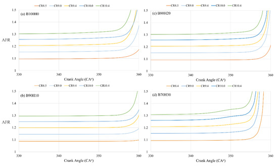 Figure 5 displays the air–fuel ratio (AFR) at different compression ratios as changing the hydrogen fraction in blends. As shown in Figure 3a–d, the AFR increases with an increased compression ratio. For instance, at B100H0, the AFR in the case of CR8.5, 9.0, 10.0, and 10.4 is about 1.1, 1.15, 1.2, 1.25, and 1.3, respectively. These values of AFR (at specific values of CR) almost remain since hydrogen fraction varied from 0 to 30% in blends. This observation indicates that the engine can only work in the condition of a lean mixture (AFR > 1) for various compression ratios. The higher the compression ratio, the greater the AFR acquired.