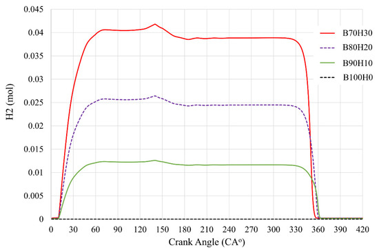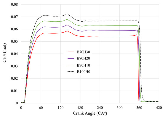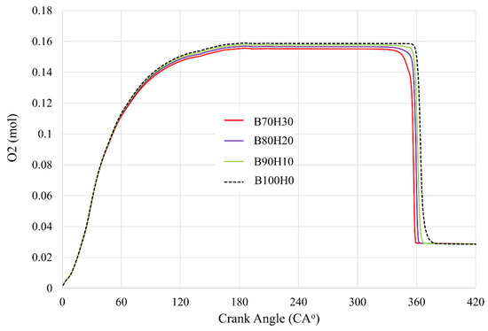 Figure 6, Figure 7 and Figure 8 show the typical concentration of CH4, H2, and O2 in the combustion chamber, respectively, at the original CR of the engine (i.e., CR = 9.4) and different hydrogen fractions in the blend. As shown in Figure 6 and Figure 8, the CH4 and O2 consumption are reduced with increasing hydrogen fraction in blends in the early phase of the combustion process. The slopes of CH4 and O2 concentration curves in the case of pure biogas (i.e., B100H0) are gradually lower than those in the cases of adding H2 into the mixture during the combustion process. For instance, the slope of CH4 and O2 consumption curves drops almost vertically after the spark timing. This is due to the existence of H2 in the blends and it results in an increase in burning speed in the combustion chamber. In other words, using H2 could improve the combustion process due to the stage of the lean mixture. Figure 7 exhibits the trend of adding H2 fractions into biogas during the intake and compression strokes of the combustion process. For instance, the H2 fractions increase rapidly at the beginning of the intake stroke and decrease suddenly at the end of the compression stroke.
