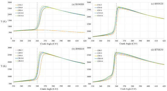 In-cylinder temperature at different compression ratios and hydrogen fractions of (a) 0%, (b) 10%, (c) 20%, and (d) 30%.