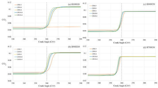 The biogas used in this study can be considered as CH4-based gas in which CO2 is mixed with CH4. Therefore, before ignition time, CO2 is still available in the chamber as shown in Figure 10a–d. For instance, in Figure 10a, the CO2 in the case of pure biogas (B100H0) exhibits a value of about 4%. This value decreases slightly because the discharge coefficient decreases with an increased compression ratio. The discharge coefficient is known as the parameter used to quantify the breathing capacity of the engine intake system [26]. However, the emission of CO2 is decreased while adding hydrogen into biogas. For instance, at a fixed crank angle, CO2 emissions in the case of without adding hydrogen are significantly higher than those in the cases of adding 10%, 20%, and 30% of hydrogen. At CR10.4, the maximum value of CO2 concentration in the cases of B100H0, B90H10, B80H20, and B70H30 is about 10.5%, 9.6%, 9.4%, and 9.0%, respectively. The dashed vertical lines in Figure 10a–d are indicated for the engine top dead center (i.e., at 360 CA°).