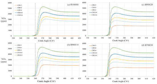 Figure 11 shows the NOx concentration with the variation of the crank angles at different compression ratios of 8.5, 9.0, 9.4, 10.0, and 10.4. The operating engine speed was 3000 rpm and fueled with biogas enriched by 0, 10, 20, and 30% of hydrogen, as shown in Figure 11a–d, respectively. The dashed vertical lines in Figure 11a–d are indicated for the engine top dead center (i.e., at 360 CA°). As shown in Figure 11a, at CR8.5, there is no combustion inside the combustion chamber, therefore, no NOx concentration existed.
