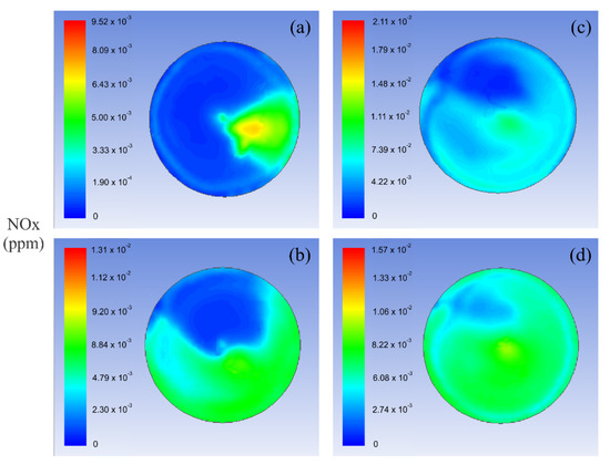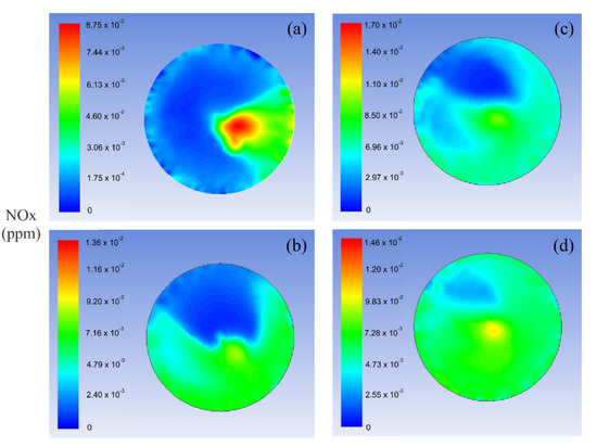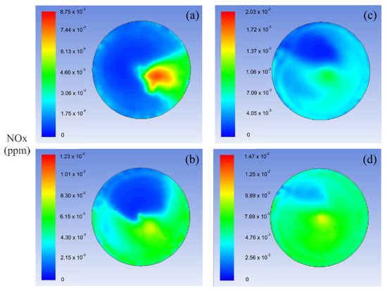 NOx distributions at B80H20, 370 CA°, and different CR of (a) 8.5, (b) 9.4, (c) 10.0, and (d) 10.4.